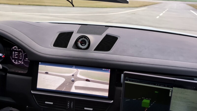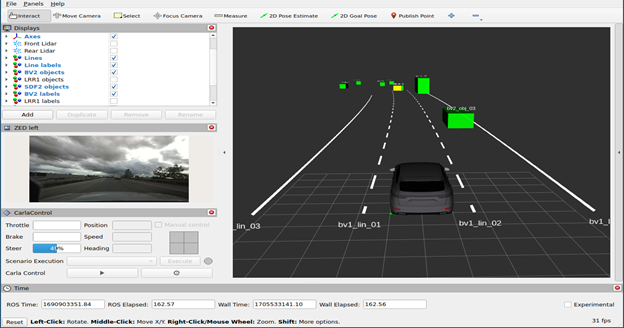 U fyzických testů využíváme vytvořené digitální dvojče, které replikuje stav reálného vozidla v simulátoru CARLA s využitím Kalmanova filtru, simuluje okolní vozidla a informace o nich injektuje zpět do řídícího systému reálného vozidla. Tímto způsobem je možné simulovat i nebezpečné situace nebo scénáře s velkým množstvím okolních vozidel, které by bylo nákladné testovat pouze s reálnými vozidly. Rovněž je možné při testech kombinovat reálná okolní vozidla se simulovanými.