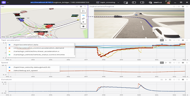Jedním z hlavních vývojových směrů v rámci CERTICAR je testování systému ALKS (Automated Lane Keeping System) a průjezdů křižovatkou. Proč právě tato oblast? ALKS představuje první systém, který umožňuje vozidlu převzít plnou kontrolu nad řízením v definovaných podmínkách, a je tak klíčovým milníkem na cestě k vyšším úrovním autonomie. Nad rámec typicky dálničního systému ALKS byla řešena i problematika autonomní mobility v městském provozu. Průjezdy křižovatkou jsou pak jedním z nejnáročnějších scénářů z hlediska bezpečnosti i komplexity rozhodování. Vývoj v rámci CERTICAR probíhá na několika úrovních – od tvorby scénářů, přes simulace v prostředí MATLAB/Simulink a CARLA, až po fyzické testy na polygonu i v reálném provozu. Klíčovým prvkem je zde propojení simulačního prostředí s testovanou komponentou pomocí softwarového rozhraní, které umožňuje obousměrnou komunikaci a detailní monitoring datových toků. Díky tomu lze efektivně porovnávat výsledky simulací s reálným chováním systému a průběžně kalibrovat modely.