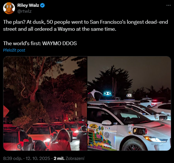 San Francisco si na autonomní robotaxi zvyká rychleji než zbytek světa. Stejně rychle se ale učí i kreativní uživatelé a kritici. V polovině října se v severovýchodní části města poblíž Coit Tower odehrála epizoda, která na několik minut proměnila nenápadnou slepou ulici v improvizovanou testovací laboratoř. Skupina mladých lidí přes mobilní aplikaci současně objednala zhruba padesát vozidel Waymo do slepé ulice. Robotaxi po příjezdu postupně zablokovala sama sebe a několik minut se marně snažila situaci vyřešit. Organizátor akce ji sám s nadsázkou popsal jako „Waymo DDoS“ – analogii kybernetického útoku zahlcením, jen v reálném městském prostoru. Waymo bezprostředně poté omezilo nástupy a výstupy v okolí na okruh dvou bloků a cestujícím, kteří se nedostavili, byl automaticky naúčtován symbolický poplatek pět dolarů. Incident se rychle rozšířil do médií a otevřel několik důležitých otázek, které přesahují hranice San Francisca.